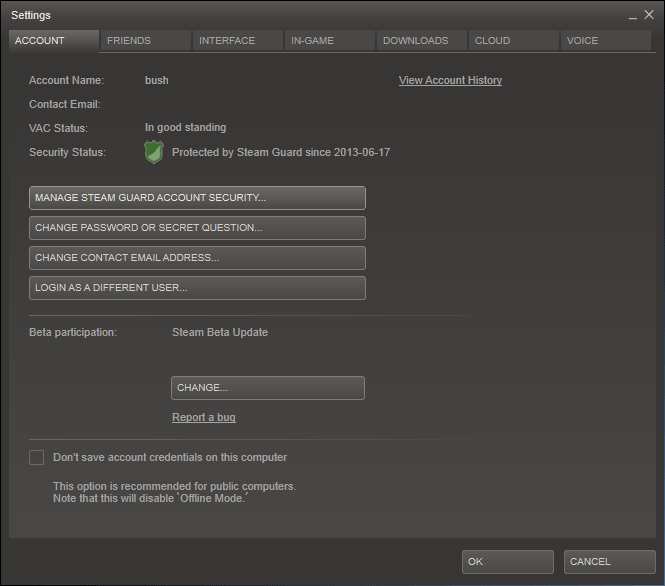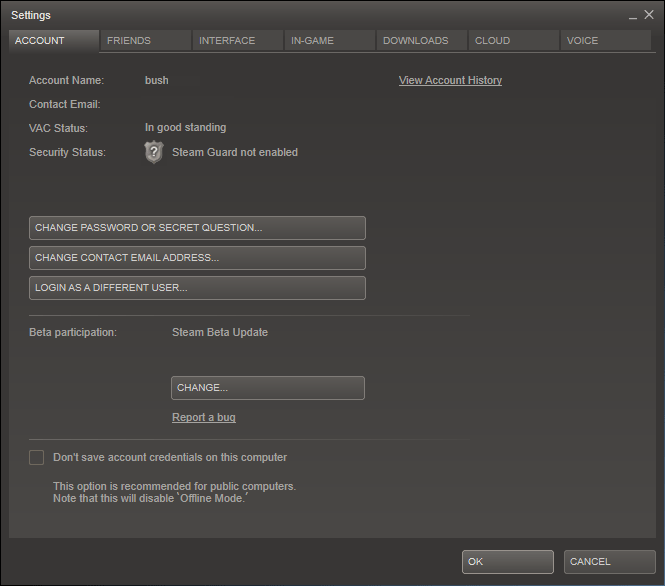 Once the address is verified your settings page will look similar to the screenshot below. Notice how it says Steam Guard is not enabled.